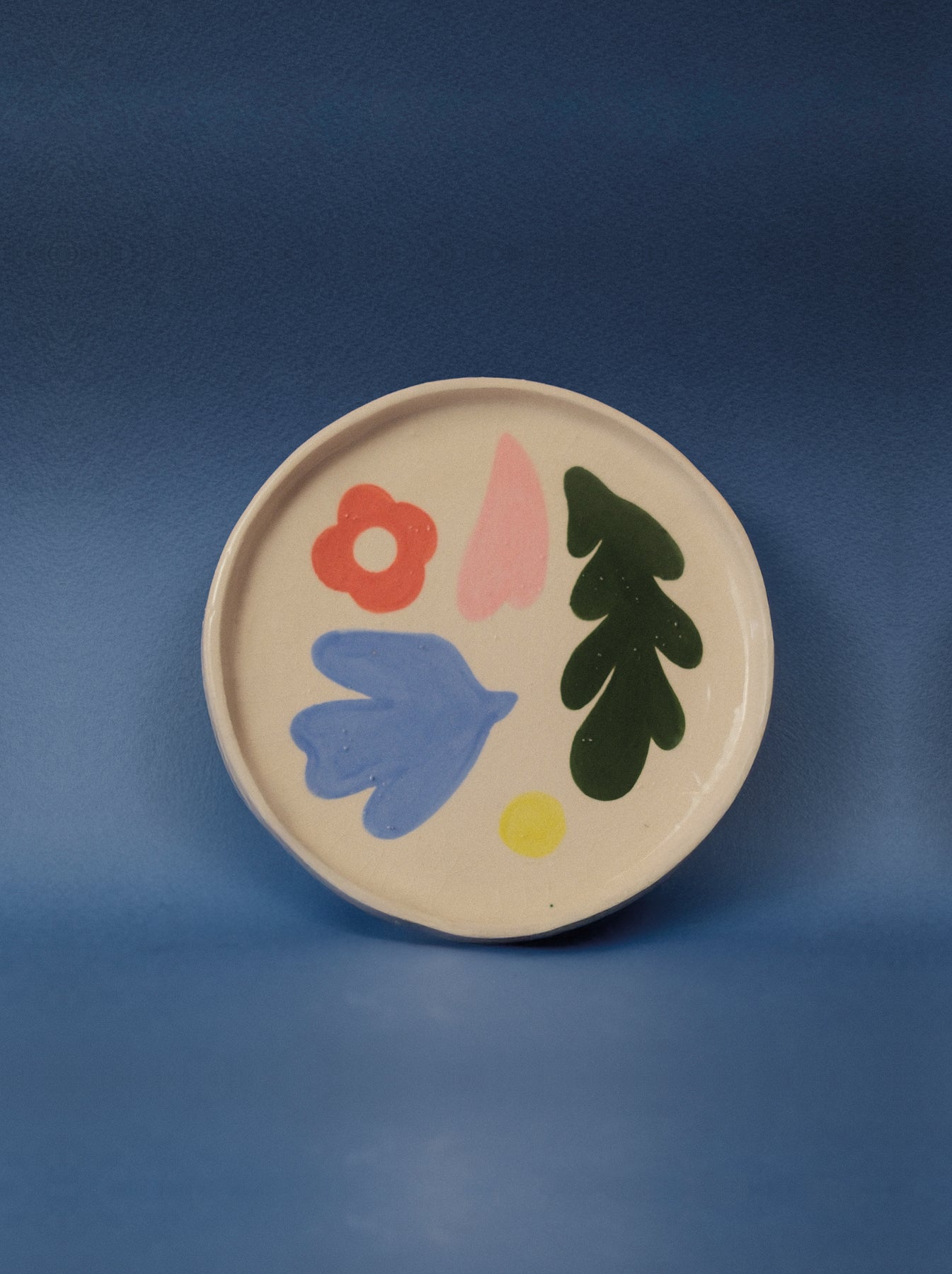 VRAI X JULIA FRECHETTE donne naissance à une série de pièces en céramique à la fois sensibles et vibrantes : tasses & soucoupes, assiettes à dessert et porte-couteaux. À partir d’un répertoire de motifs communs, Julia Fréchette compose librement, laissant sa main et sa palette tracer des variations fraîches, colorées et singulières.