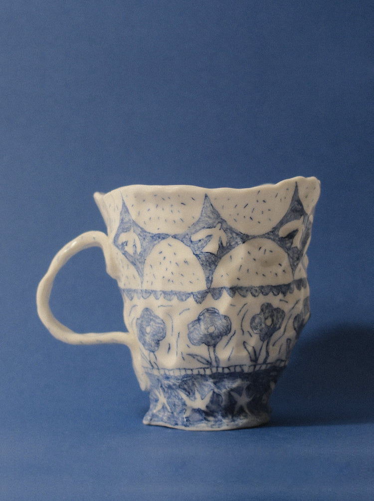 Douces et sensibles, ces pièces uniques réalisées à la main invitent le quotidien à se mêler à l’imaginaire, transformant l’utile en poétique. Les nuances de bleu et de blanc composent un récit visuel où chaque trait raconte une histoire, ouvrant la voie à la contemplation et à la rêverie.